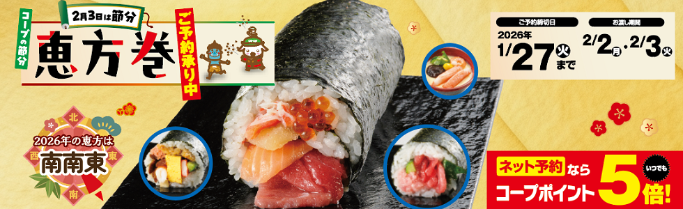 - 本日より、コープの節分恵方巻の予約を開始しました。最寄りの店舗とお好きな時間を選択して、当日受け取りください。ご予約お待ちしております!