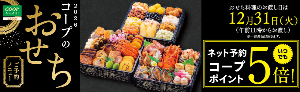 - みやぎ生協・コープふくしま各店頭受取の、お正月ご予約メニューの予約を開始しました!厳選5品が、10/30まで早期ご予約で8%引き!ご予約お待ちしております!