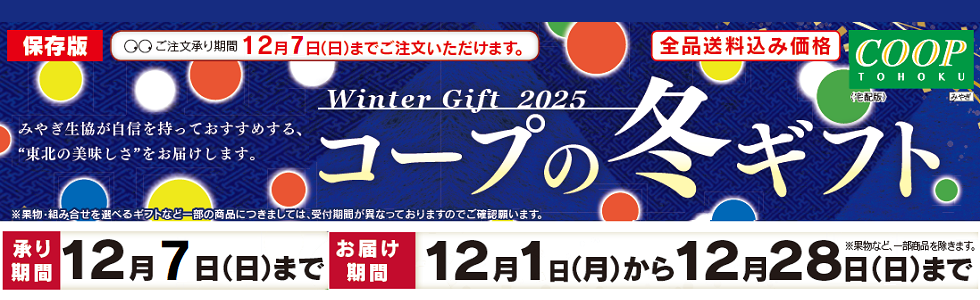 - コープの冬ギフトの取り扱いを開始しました。みやぎ生協が自信を持っておすすめする、"東北の美味しさ"をお届けします。