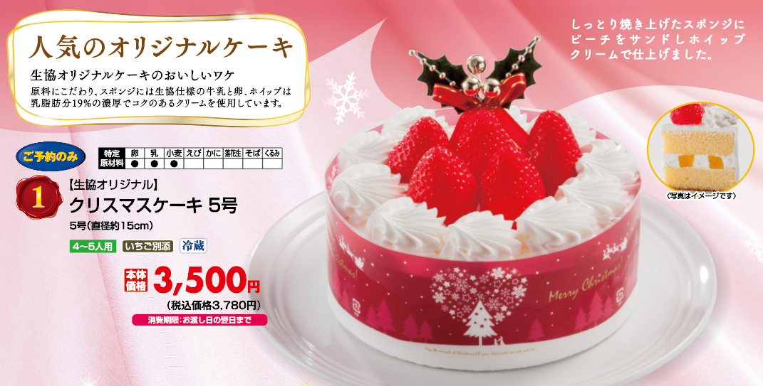 ◎ご予約のみ ◎5号(直径約15cm) ◎4~5人用 ◎冷蔵 ◎いちご別添 ◎消費期限: お渡し日の翌日まで ◎ご予約締め切り日: 12月16日(火) ◎商品お渡し期間: 12月23日(火)~12月25日(木)