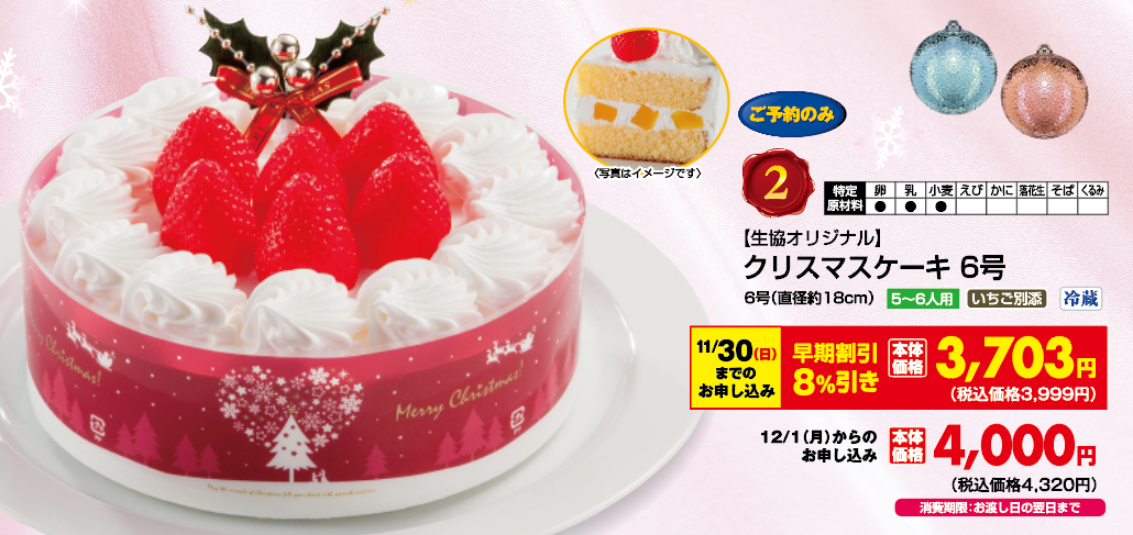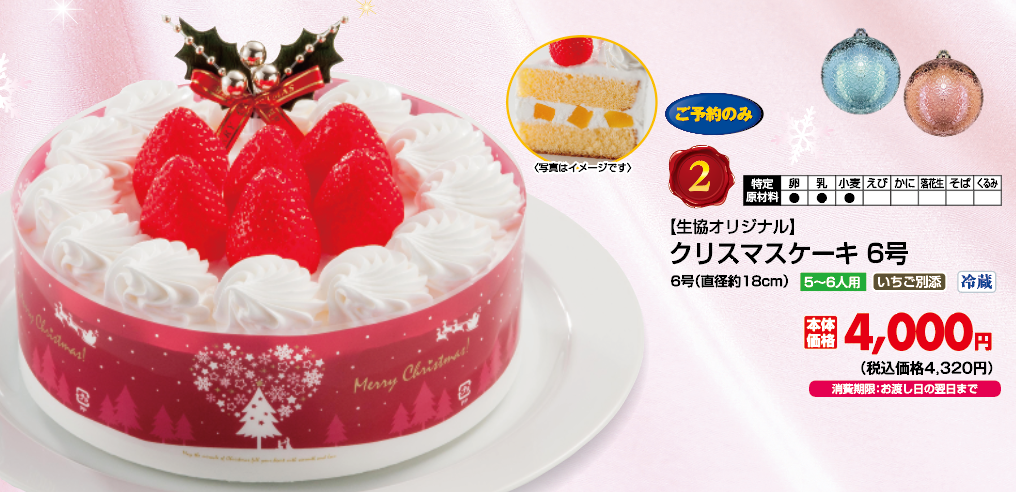 ◎ご予約のみ ◎6号(直径約18cm) ◎5~6人用 ◎冷蔵 ◎いちご別添 ◎消費期限: お渡し日の翌日まで ◎ご予約締め切り日: 12月16日(火) ◎商品お渡し期間: 12月23日(火)~12月25日(木)