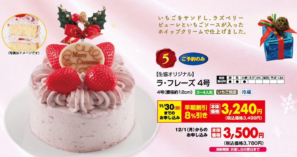 ◎ご予約のみ ◎4号(直径約12cm) ◎3~4人用 ◎冷蔵 ◎いちご別添 ◎消費期限: お渡し日の翌日まで ◎ご予約締め切り日: 12月16日(火) ◎商品お渡し期間: 12月23日(火)~12月25日(木)