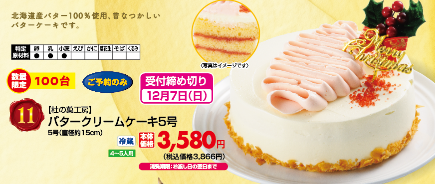 ◎ご予約のみ ◎数量限定100台。限定数量になり次第、予約終了とさせて頂きます ◎5号(直径約15cm) ◎4~5人用 ◎冷蔵 ◎消費期限: お渡し日の翌日まで ◎ご予約締め切り日: 12月7日(日) ◎商品お渡し期間: 12月23日(火)~12月25日(木)