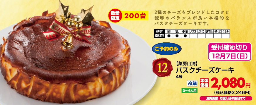 ◎ご予約のみ ◎数量限定200台。限定数量になり次第、予約終了とさせて頂きます ◎4号 ◎3~4人用 ◎冷蔵 ◎消費期限: お渡し日の翌日まで ◎ご予約締め切り日: 12月7日(日) ◎商品お渡し期間: 12月23日(火)~12月25日(木)