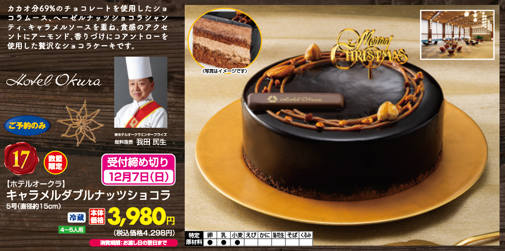 ◎ご予約のみ ◎限定数量になり次第、予約終了とさせて頂きます ◎5号(直径約15cm) ◎4~5人用 ◎冷蔵 ◎消費期限: お渡し日の翌日まで ◎ご予約締め切り日: 12月7日(日) ◎商品お渡し期間: 12月23日(火)~12月25日(木)