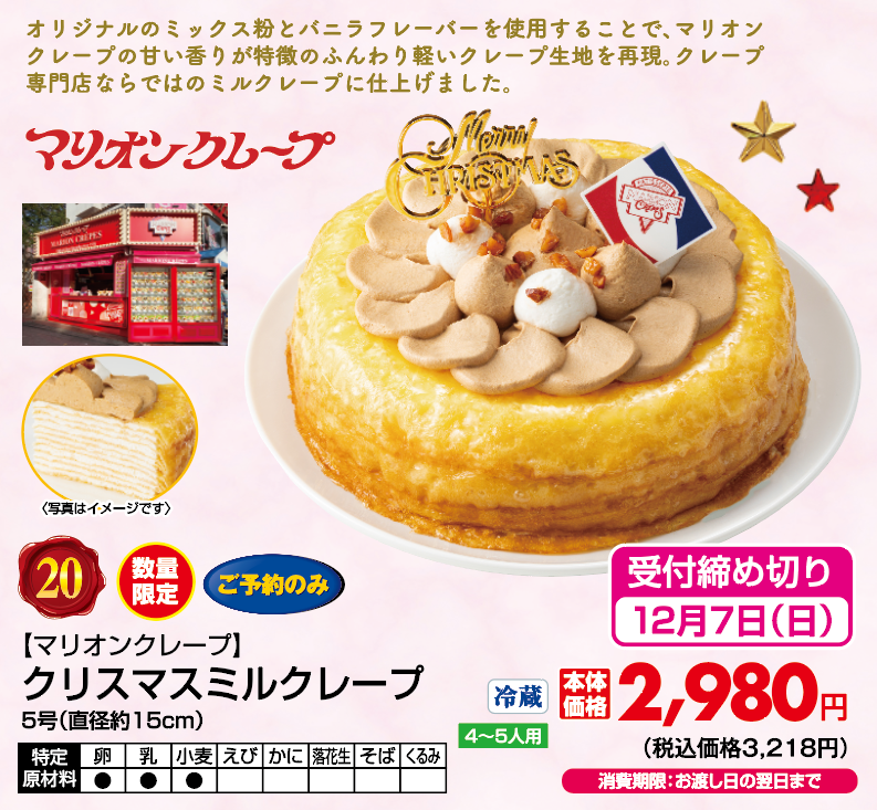 ◎ご予約のみ ◎限定数量になり次第、予約終了とさせて頂きます ◎5号(直径約15cm) ◎4~5人用 ◎冷蔵 ◎消費期限: お渡し日の翌日まで ◎ご予約締め切り日: 12月7日(日) ◎商品お渡し期間: 12月23日(火)~12月25日(木)