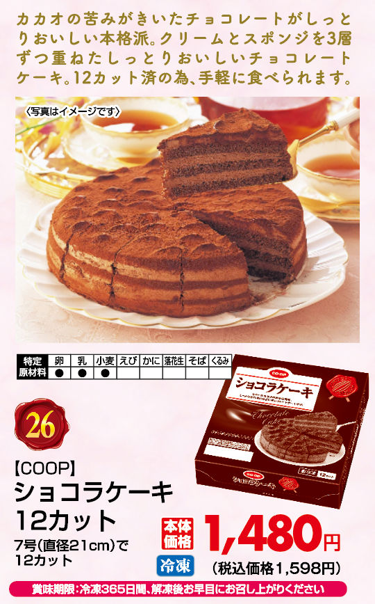 ◎7号(直径21cm)で12カット ◎冷凍 ◎賞味期限: 冷凍365日、解凍後お早目にお召し上がりください ◎ご予約締め切り日: 12月16日(火) ◎商品お渡し期間: 12月23日(火)~12月25日(木)