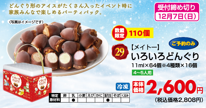 ◎ご予約のみ ◎数量限定110個。限定数量になり次第、予約終了とさせて頂きます ◎11ml×64個 ※4種類×16個 ◎4~5人用 ◎冷凍 ◎ご予約締め切り日: 12月7日(火) ◎商品お渡し期間: 12月23日(火)~12月25日(木)