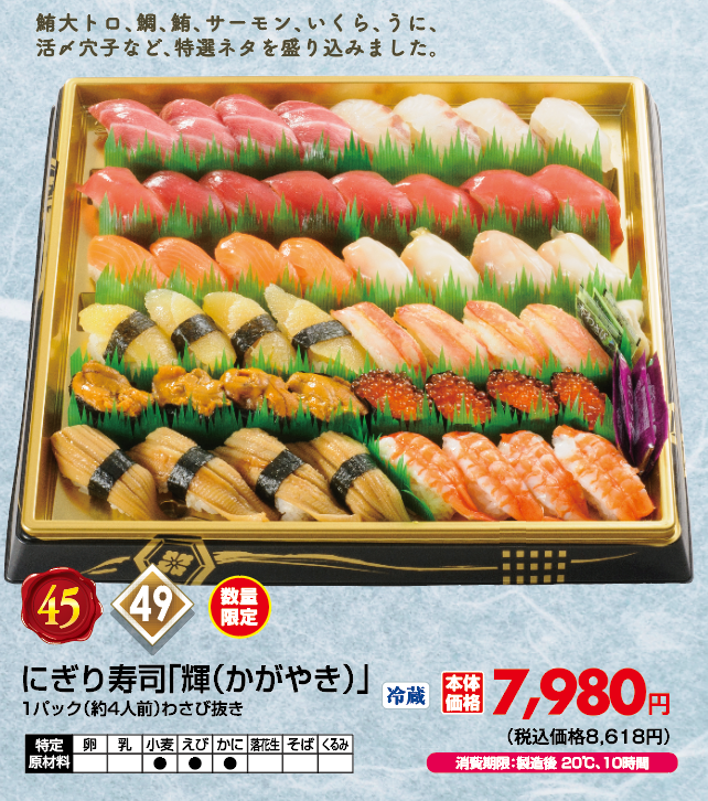 ◎限定数量になり次第、予約終了とさせて頂きます ◎1パック(約4人前)わさび抜き ◎冷蔵 ◎消費期限: 製造後 20℃、10時間 ◎ご予約締め切り日: 12月16日(火) ◎商品お渡し期間: 12月23日(火)~12月25日(木)