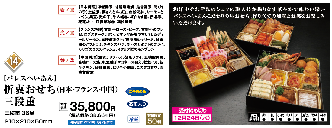 【パレスへいあん】折衷おせち(日本・フランス・中国) 三段重