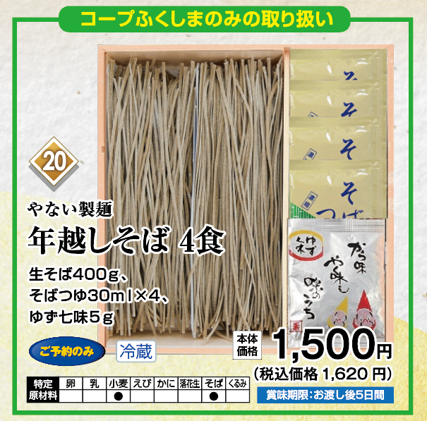 ◎生そば400g、そばつゆ30ml×4、ゆず七味5g
