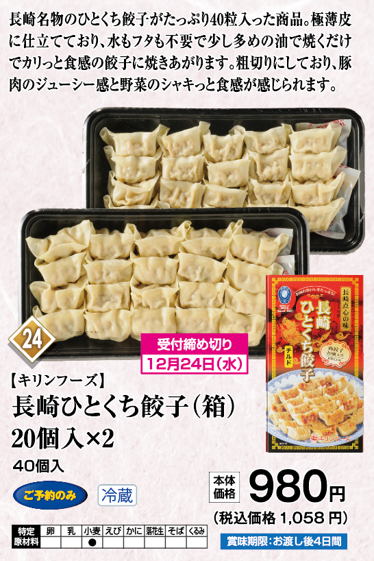 ◎ご予約のみ ◎40個入 ◎冷蔵 ◎賞味期限: お渡し後4日間 ◎受付締め切り日: 12月24日(水) ◎商品お渡し日: 12月30日(火)~12月31日(水)11時~18時