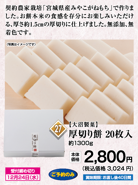 ◎ご予約のみ ◎約1300g ◎賞味期限: お渡し後40日間 ◎受付締め切り日: 12月24日(水) ◎商品お渡し日: 12月30日(火)~12月31日(水)11時~18時