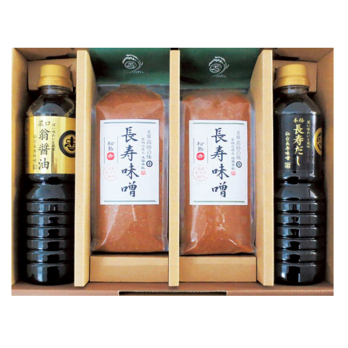 ◎長寿味噌700g×2、翁醤油500ml×1、長寿だし500ml×1